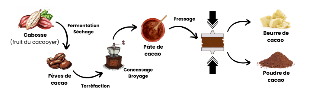 Tout d’abord, il faut comprendre comment sont faits ces différents types de chocolat. À la base, la cabosse, le fruit contenant les fèves de cacao, est récoltée, puis les fèves sont fermentées et séchées. Par la suite, elles sont torréfiées en les faisant chauffer un certain temps, avant d’être broyées. Les fèves broyées se transforment en pâte de cacao, qui peut être compressée pour extraire le beurre de cacao et séparer le cacao, qui sera réduit en poudre.